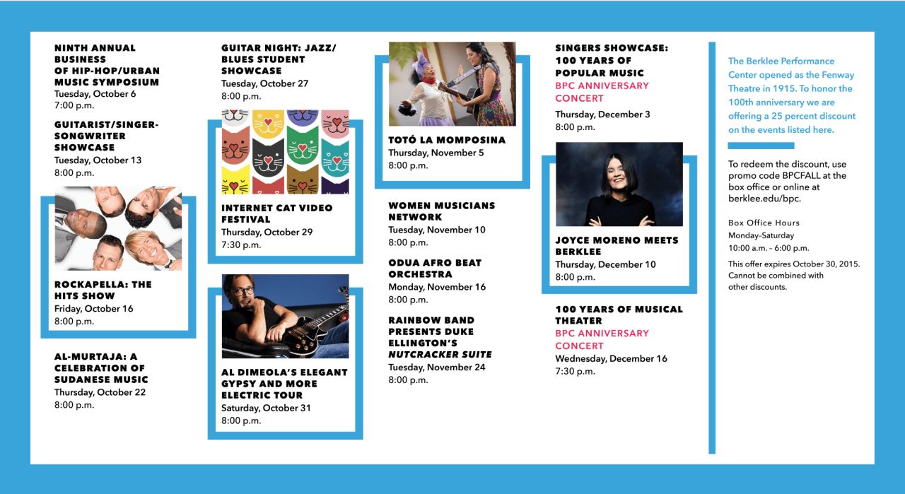 Working in-house at Berklee was a fun adventure. One thing I can say that I have never had my “creative freedom” stifled, and likewise, it has been rare that I can say working in-house was easy. I found working with an existing brand system had challenges and rewards. A brand lives or dies by how it’s implemented well beyond the final approval of the logo, color scheme, and letterhead. At Berklee, creating posters, books, postcards, handouts, keynotes, exhibits, and other print materials gave me hands-on experience in how people interacted with the college and its global brand.