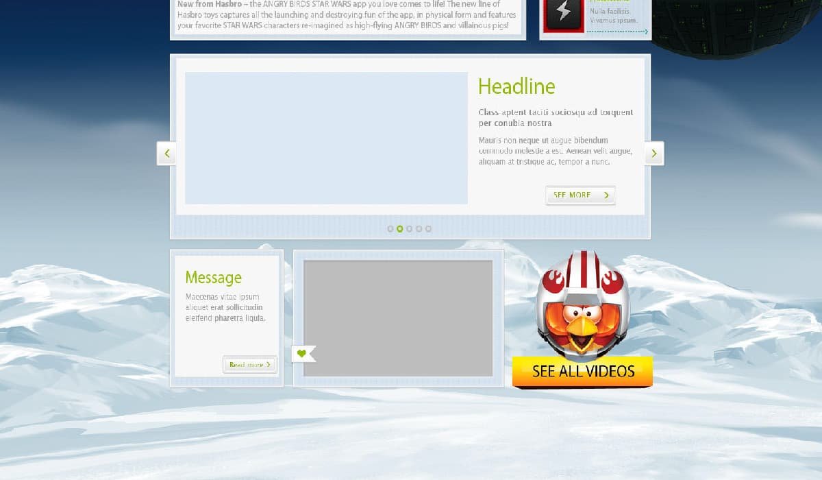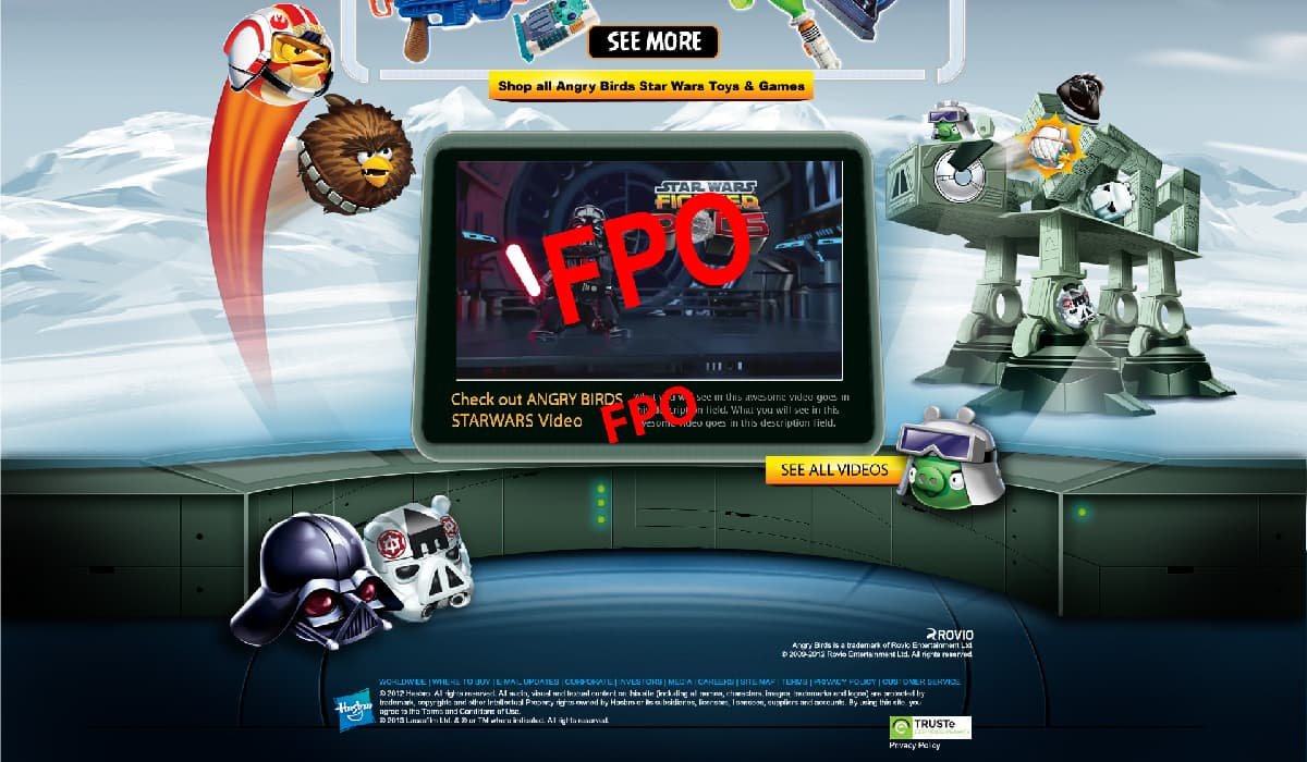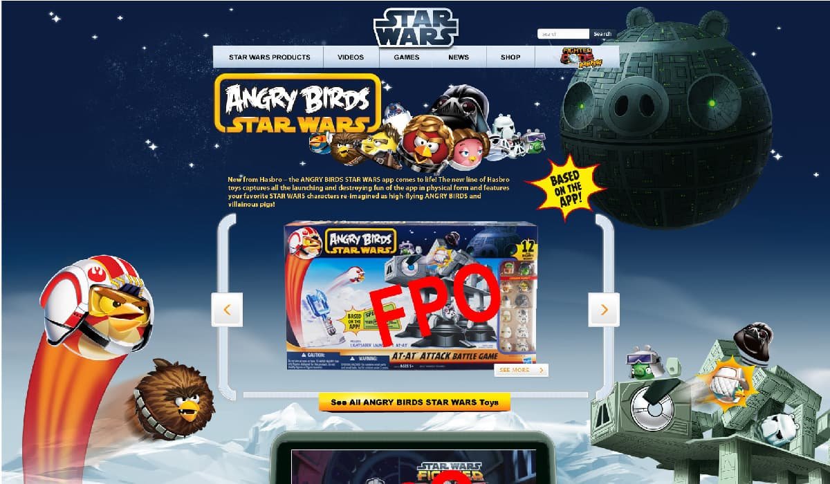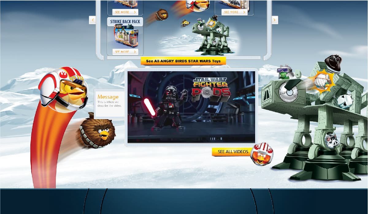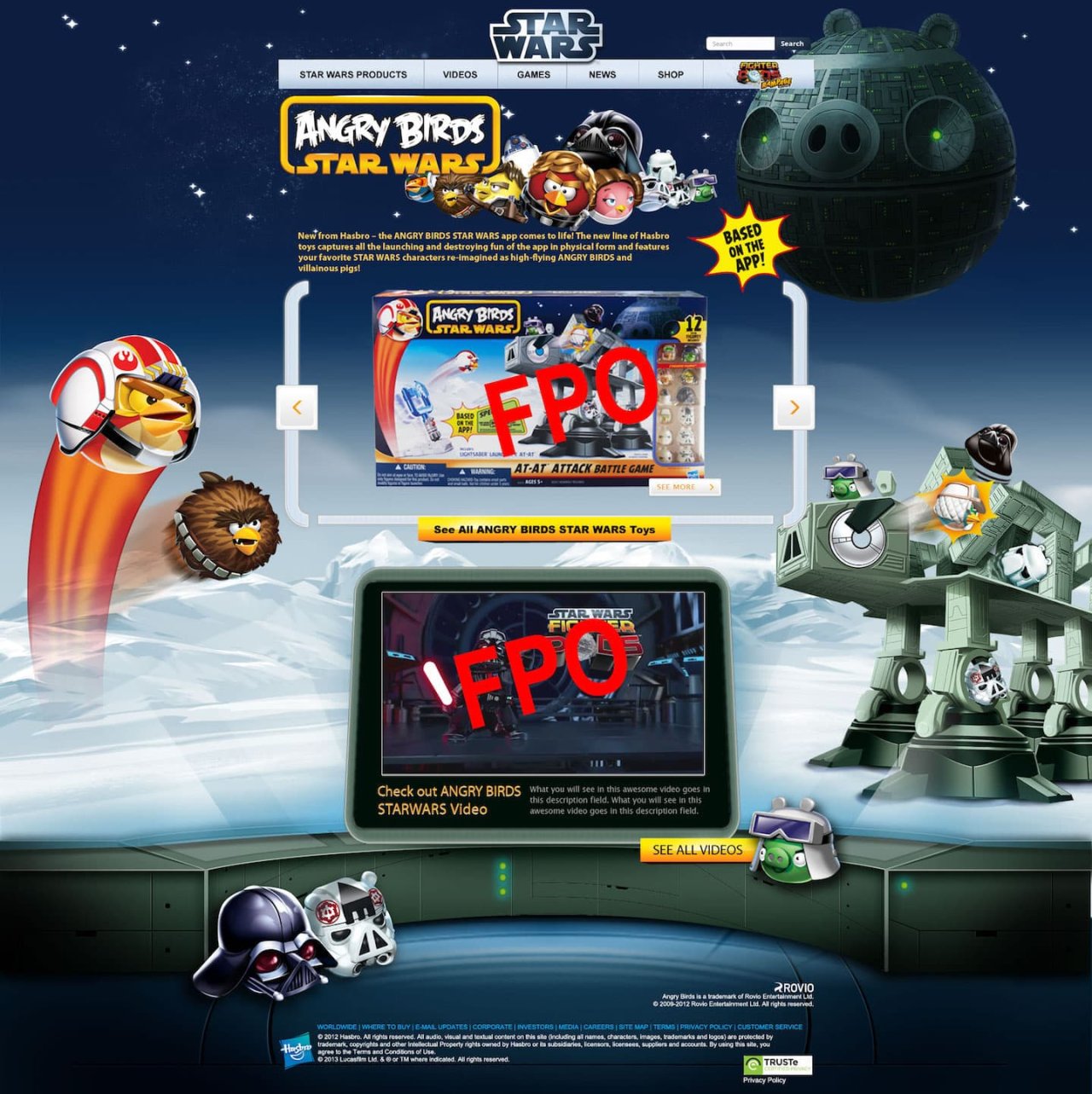 What I designed was a uniquely Hasbro, Star Wars Angry Birds landing page with a story to tell. That story echoed in the games lore, and star wars history. It was a blast to produce.
