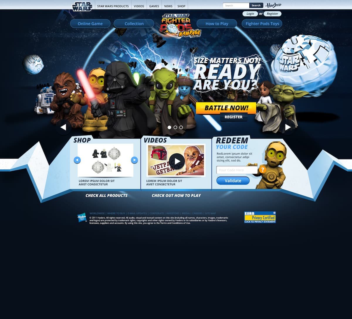 With brief in hand, I started brainstorming about what story the page should tell and what the marketing team needed. First looking at how Hasbro already built sub-branded Star Wars pages, then how the product was position on Rovio’s end. There wasn’t too much to mimic without causing confusion on the intent. The page was for physical products not a game like the other Star Wars examples given.