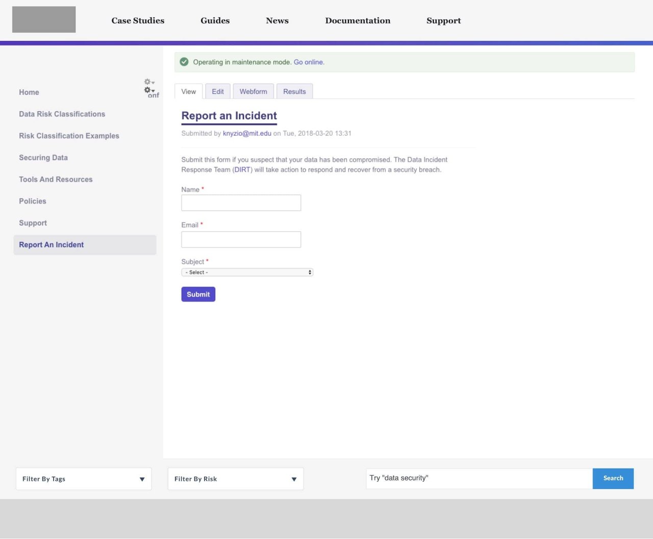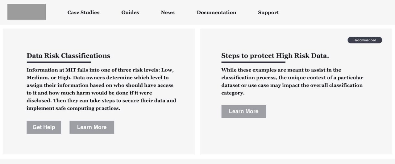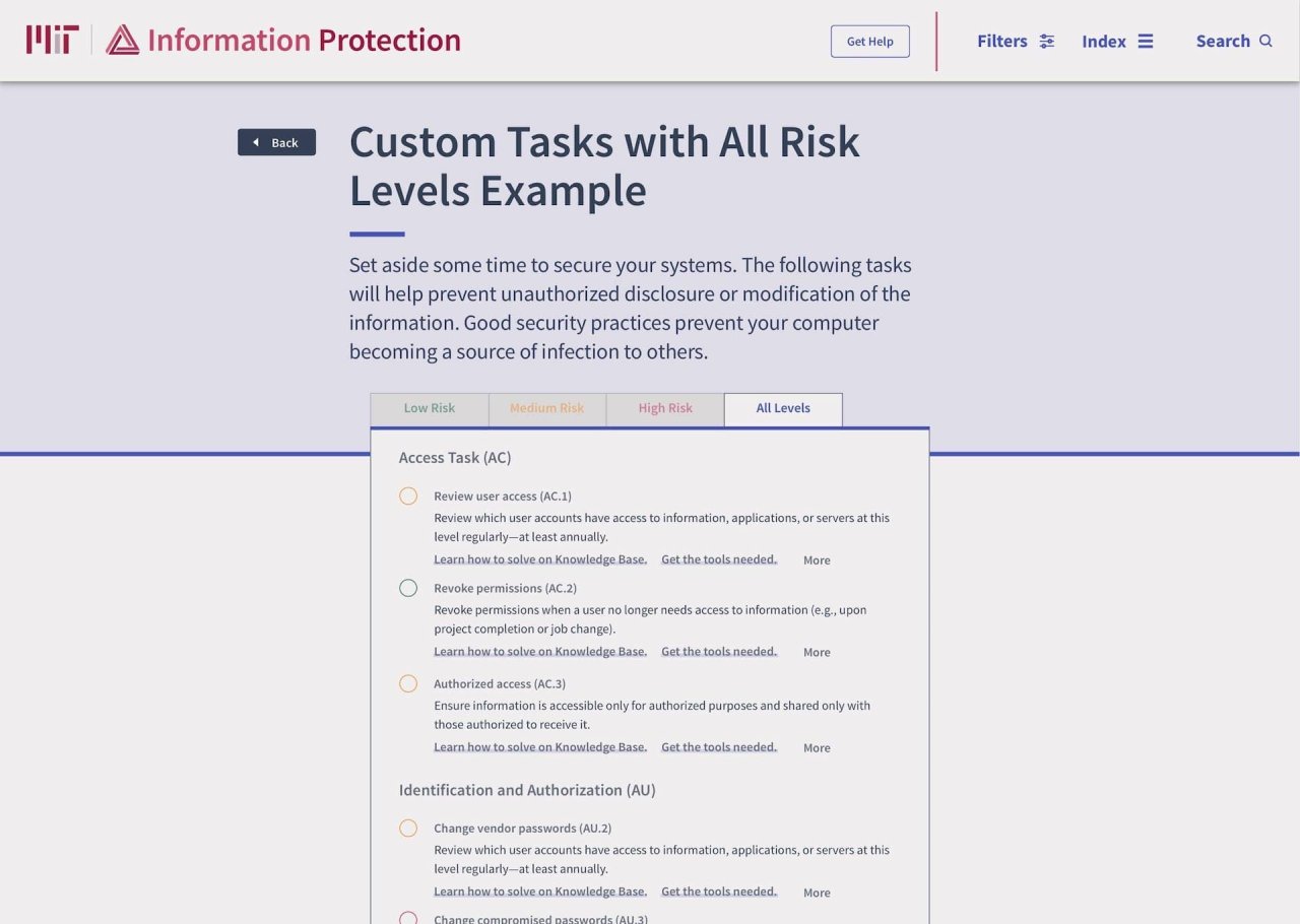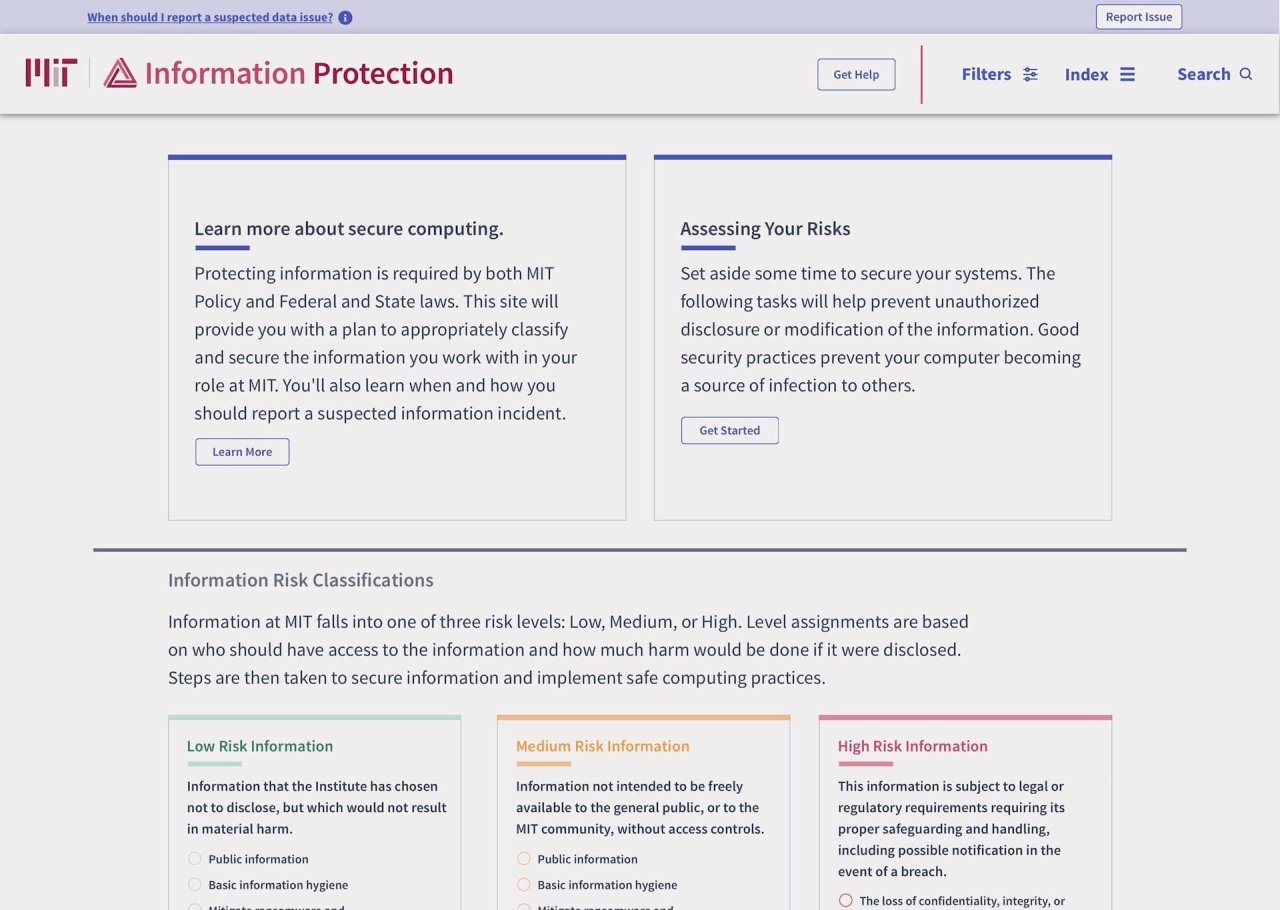 MIT needed to create a security resource for its community to adopt. A tool that educates, guides, sets the standard, and presents clear strategies for protecting sensitive data, both digital and physical. 2 years' worth of research from multiple committees had honed the policy down to a series of classifications. Each classification had tasks associated with it, and the expectation was to have the community follow the policy.